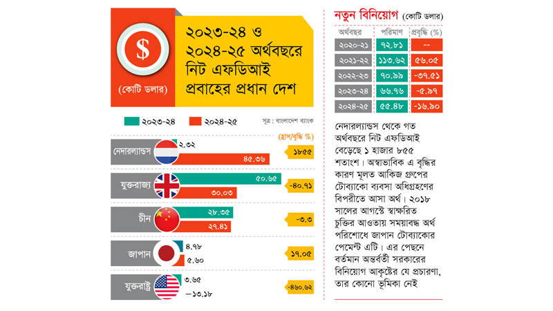বিনিয়োগের বড় উৎস দেশগুলোর বিনিয়োগ কমলেও ২০২৪-২৫ অর্থবছরে বাংলাদেশে নিট এফডিআই প্রবাহ বেড়েছে। এ বৃদ্ধিতে প্রধান ভূমিকা রেখেছে অধিগ্রহণের বিপরীতে নেদারল্যান্ডস থেকে জেটির পাঠানো অর্থ। এর সঙ্গে যুক্ত হয়েছে পুনর্বিনিয়োগ এবং আন্তঃপ্রতিষ্ঠান ঋণ।